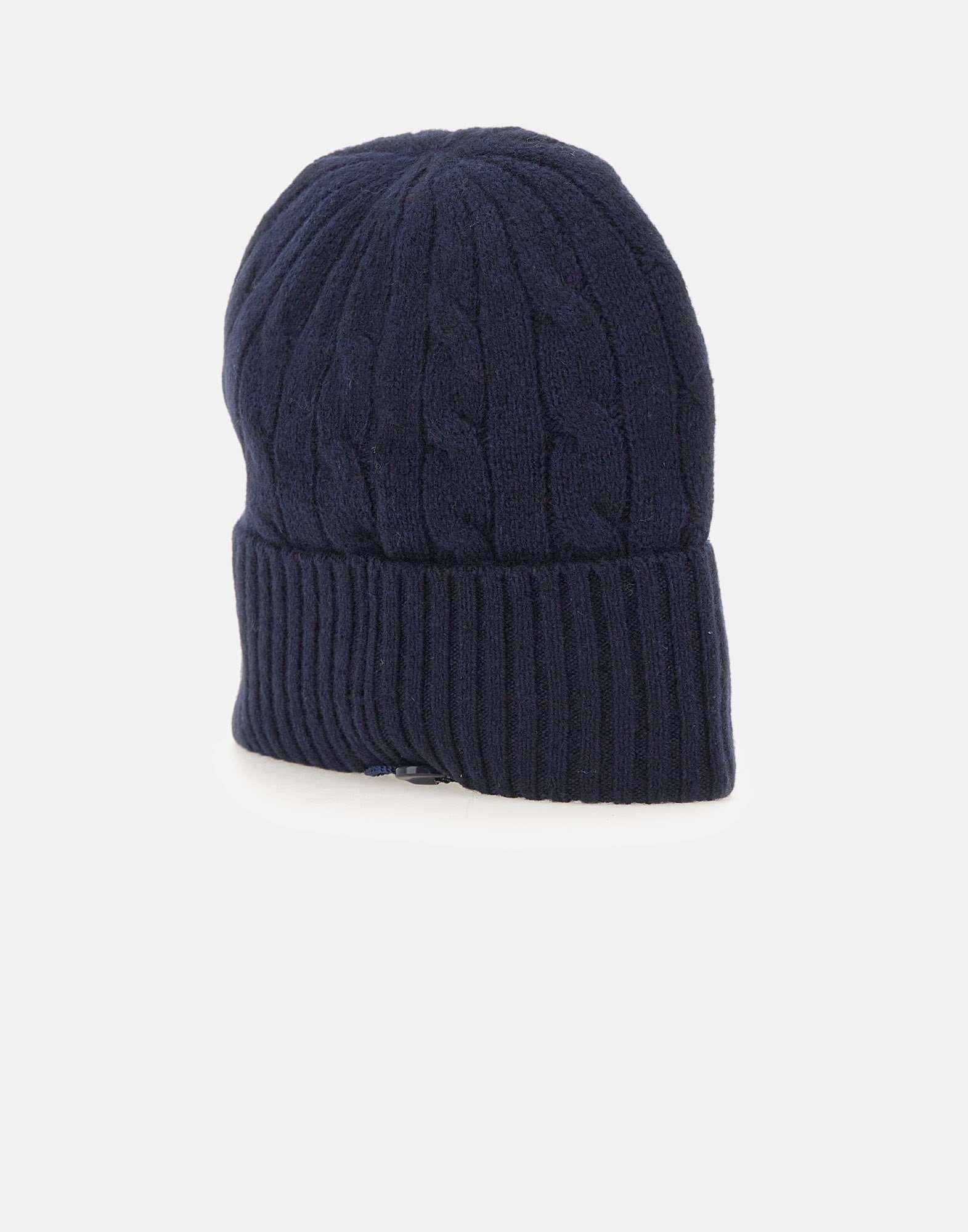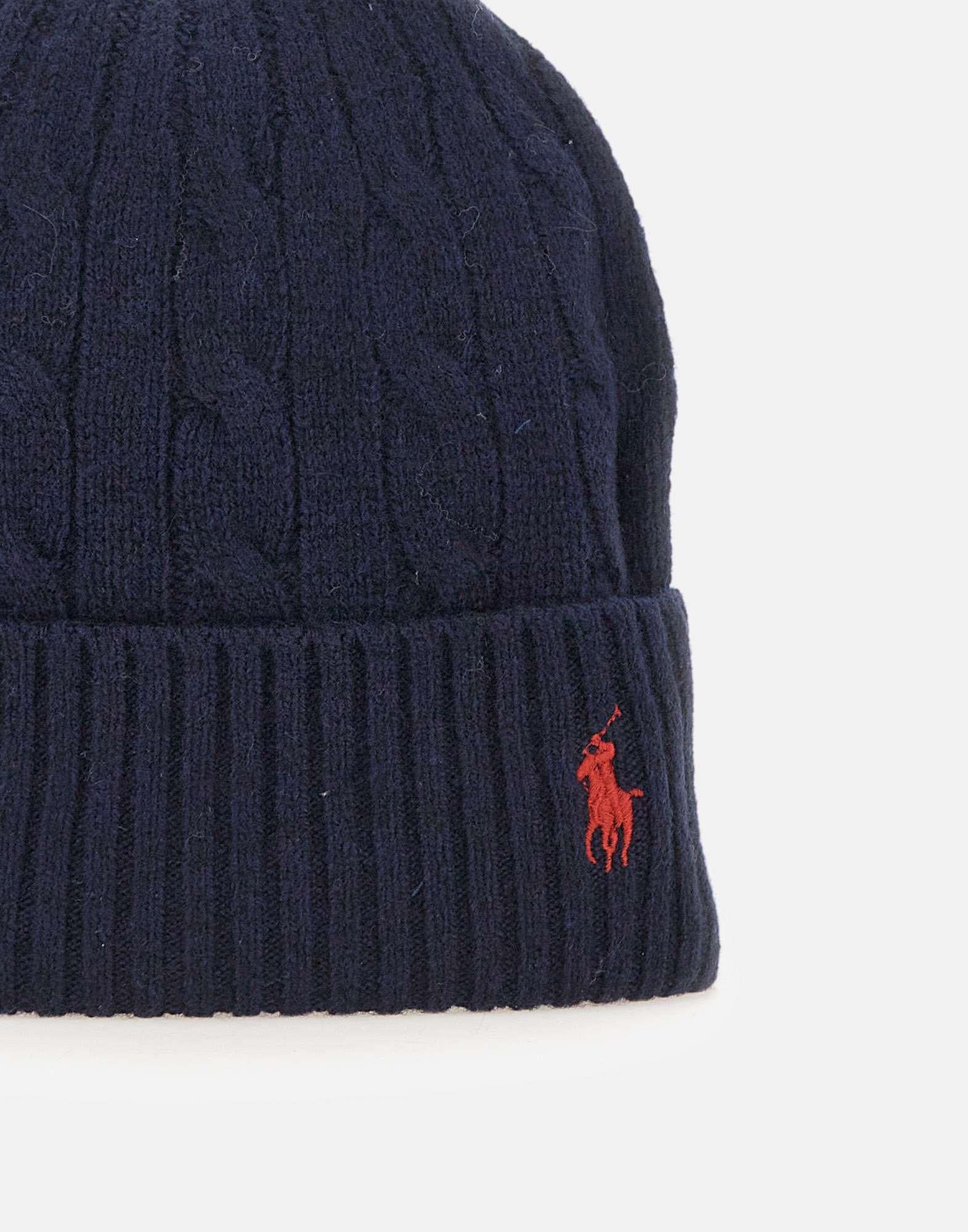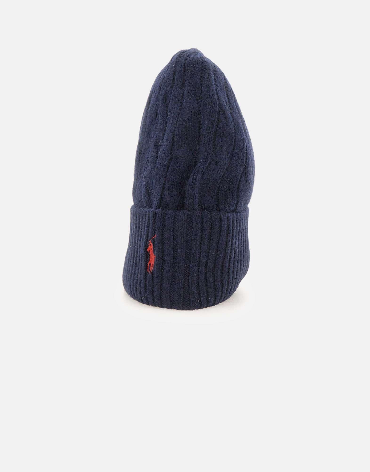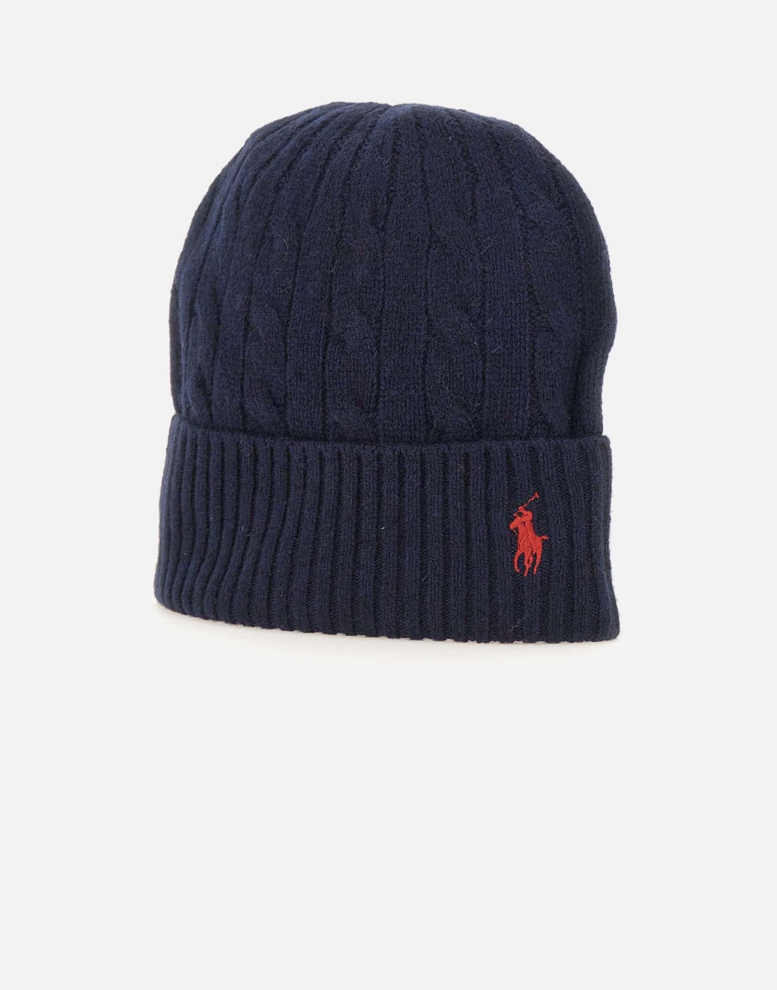 Polo Ralph Lauren woman beanie in a luxurious wool and cashmere blend, navy blue color. Featuring a classic cable-knit pattern, ribbed cuff, and iconic embroidered Polo logo at front. One size fits all, ideal for elevating your winter wardrobe.