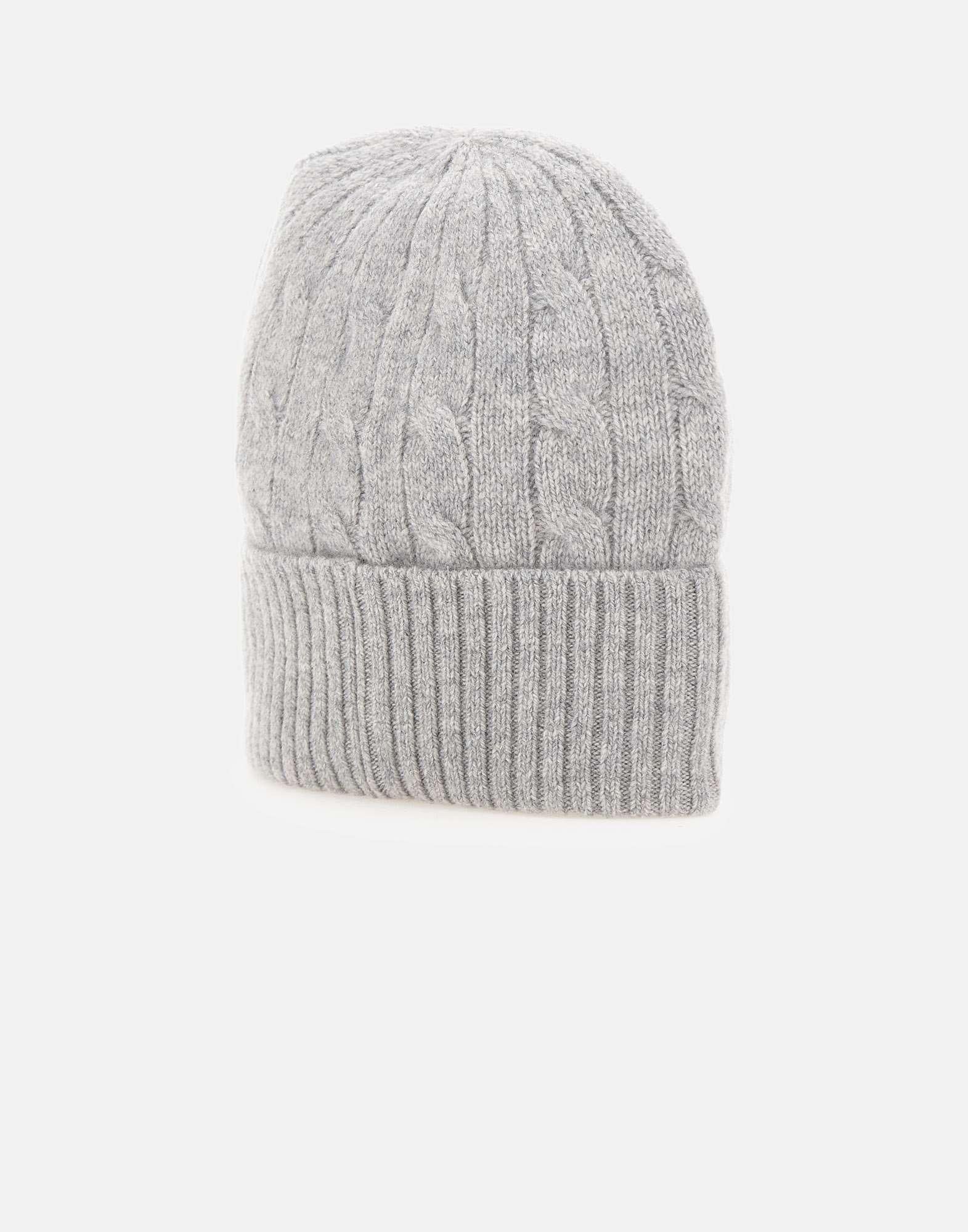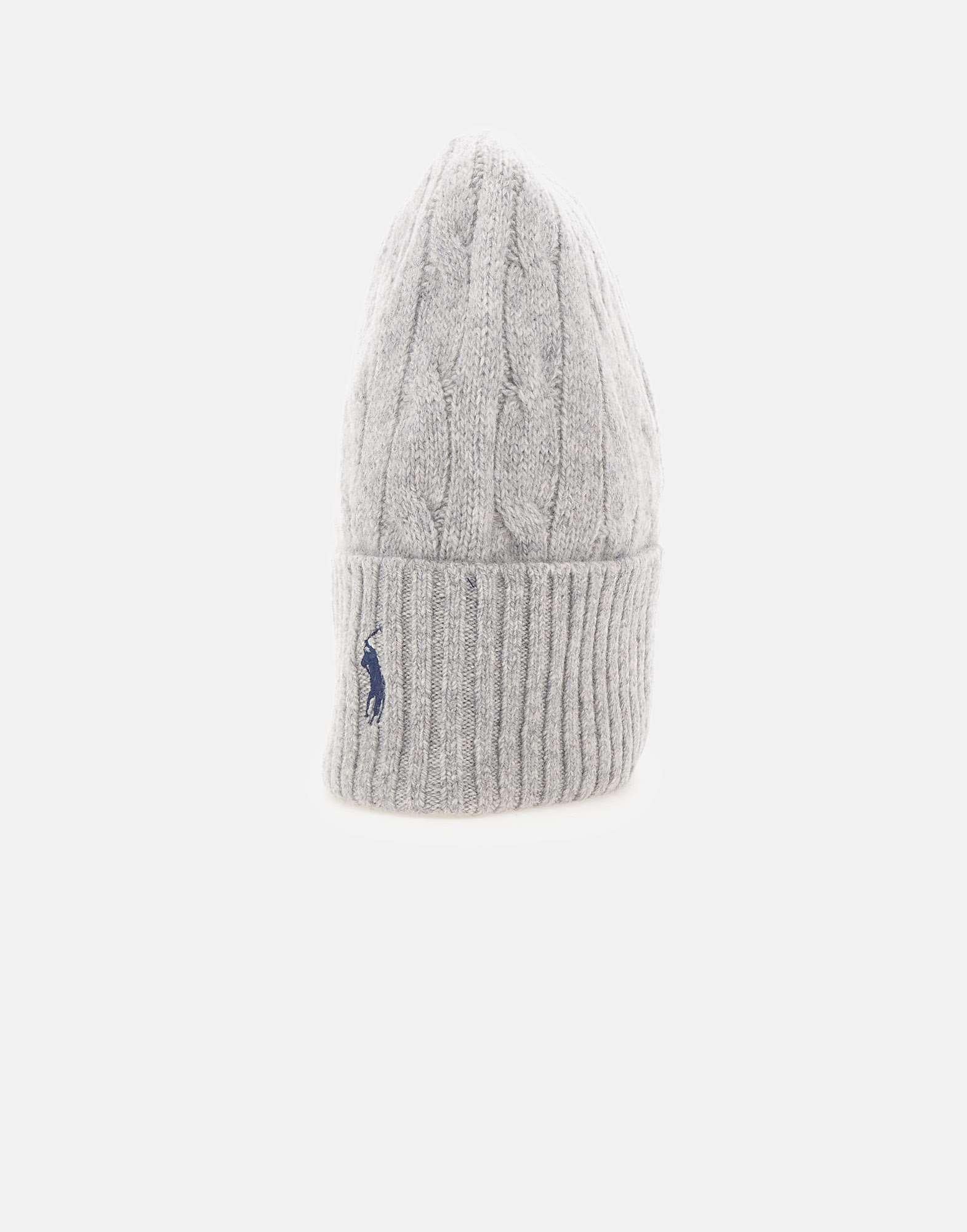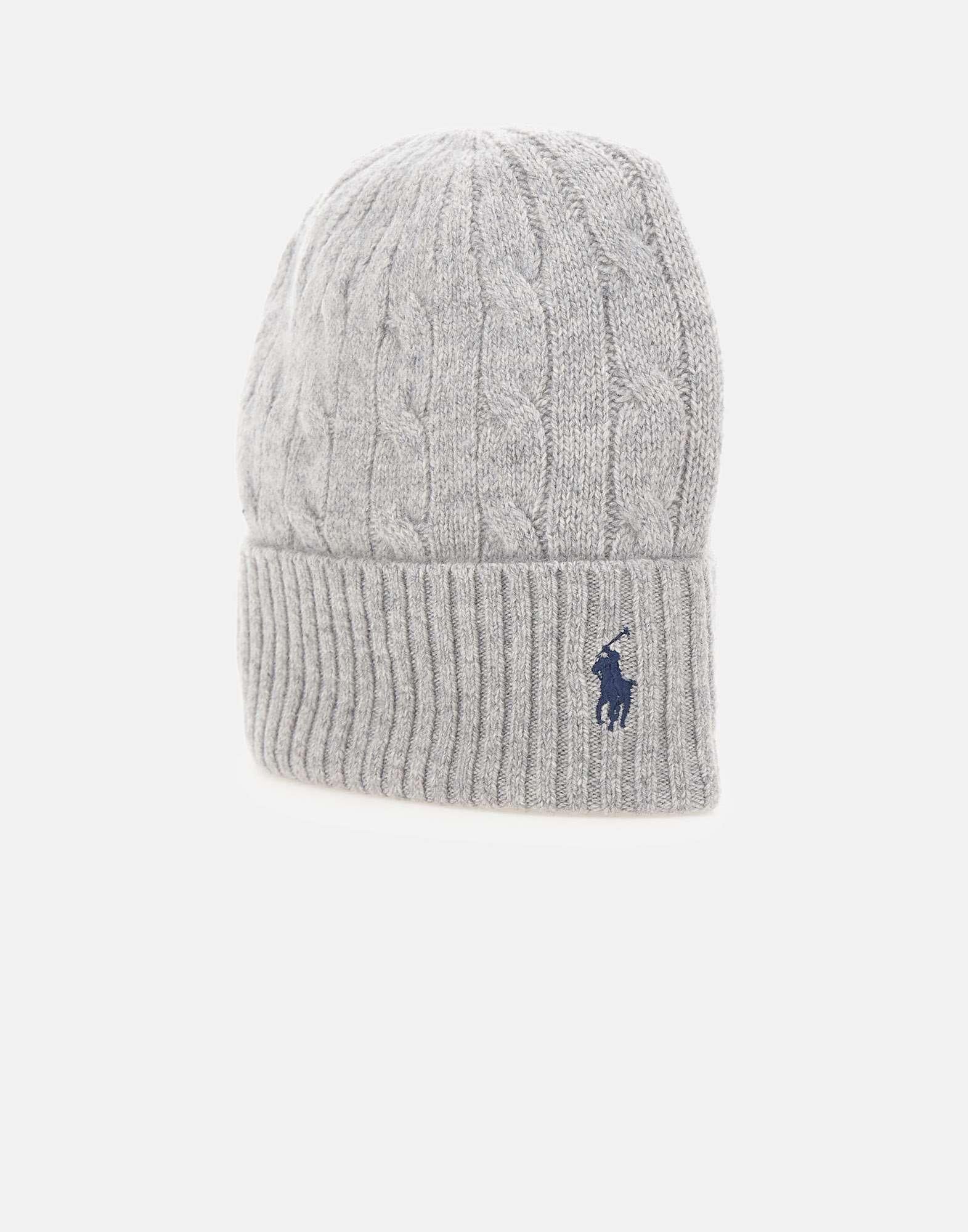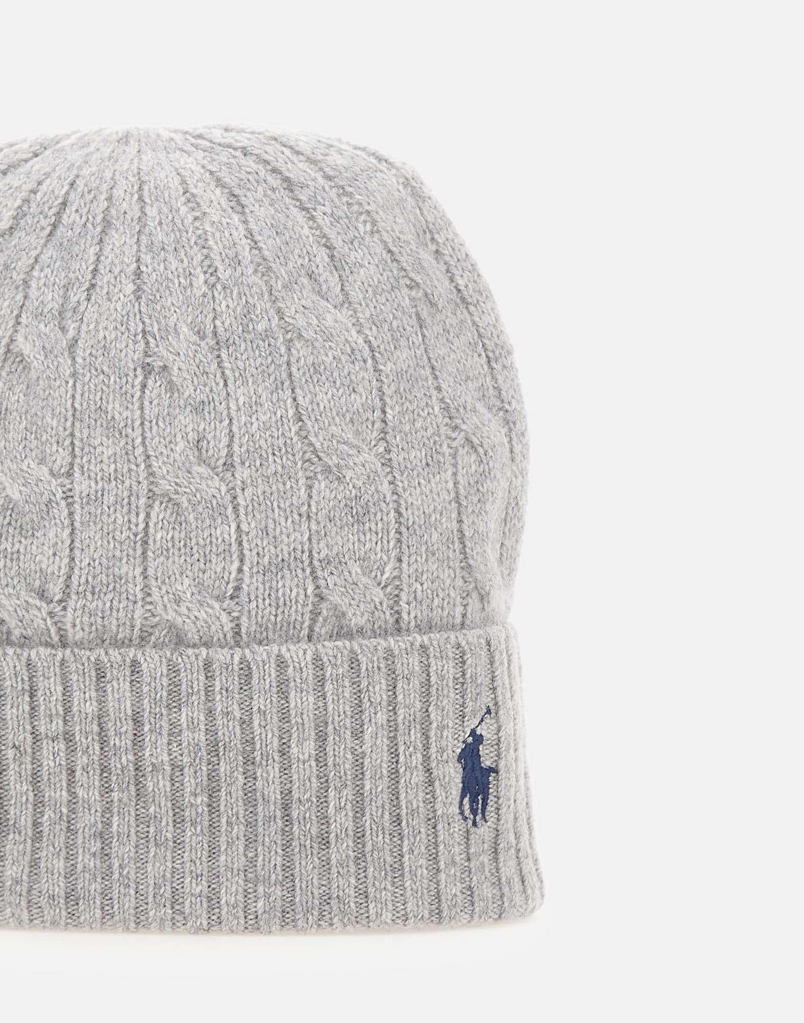 Polo Ralph Lauren woman beanie in a luxurious wool and cashmere blend, grey color. Featuring a classic cable-knit pattern, ribbed cuff, and iconic embroidered Polo logo at front. One size fits all, ideal for elevating your winter wardrobe.