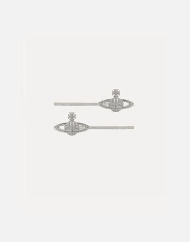 Vivienne Westwood ‘Bobby’ hair clips, Orb detail, shiny platinum plating, metal frame. Length 6 cm