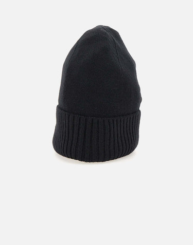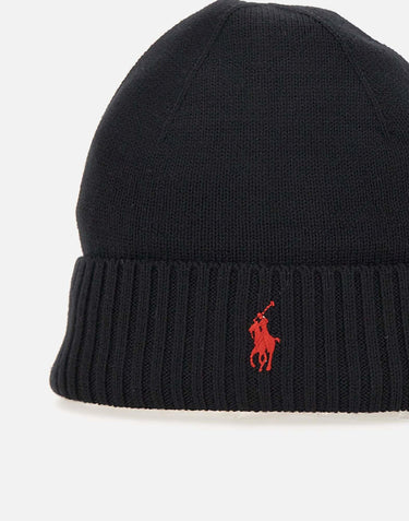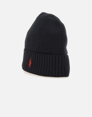 Polo Ralph Lauren "M.Classic" men's wool cap, black, ribbed workmanship, with turn-up, iconic red logo embroidered on front. One size.