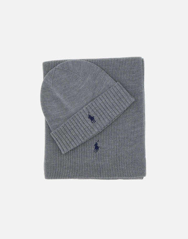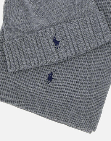 Polo Ralph Lauren "Classics" men's wool hat and scarf set, grey, ribbed weave, contrasting color embroidered logo, width 25cm, length 180cm.