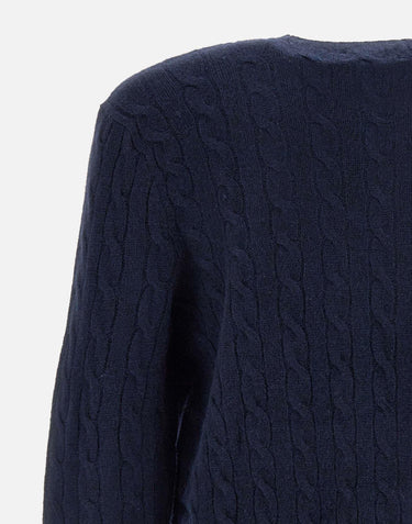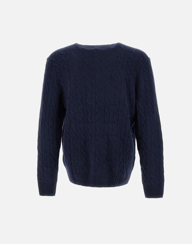 Polo Ralph Lauren "Classic" men's wool and cashmere sweater, navy blue color, crew neck, ribbed hems, cable knit, iconic red embroidered logo on chest, ideal for autumn and winter seasons. Regular fit