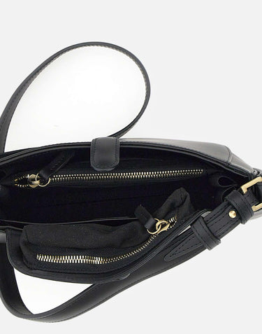 Mandel "Luna" shoulder bag, black, smooth Italian leather, cotton-polyester and microsuede lining, built- mini pouch, closure with buttons, large compartment, zippered pocket, card slots, phone and glasses compartment, adjustable shoulder strap, antique gold plating. Length: approximately 10-24 cm
