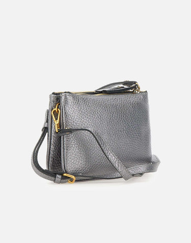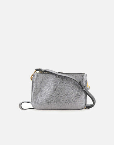 Gianni Chiarini "Frida" double grain leather with drummed effect shoulder bag, silver color, double compartment with two-in-one effect with zip closure, antique gold plating, adjustable and removable shoulder strap approx. 90cm, logo embossed on the outside on the bottom, made in Italy, dimensions: 24cm length, 5cm depth, 16cm height. Dust bag included