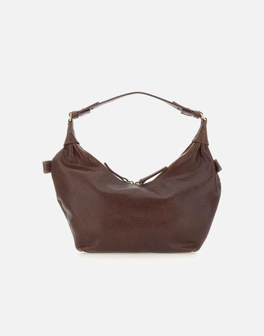 Mandel "Croissant" shoulder bag, chocolate, Italian crocodile-print leather, gold plating, double-slider zip closure, top handle, internal zip pocket,