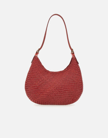Dragon Diffusion Luna mezza shoulder bag, bright red, calfskin leather, woven, adjustable top handle, antique gold plated, round shape, unlined, measurements: Width: 13.77 inches / 35 cm. Length: 10.62 inches / 27 cm, 8 cm depth,dustbag included. On inside of each bag is a hand-stitched pendant depicting an antiqued medal of St. Christopher, homage to patron saint of travellers, the brand's seal of authenticity.