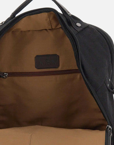 Scharlau "Giant" men's backpack, black with dark brown profiles, cotton canvas and cowhide, Baobab collection, metal plate inside to personalize with an engraving name or a message, two large main compartments with a reinforced one for a 15.6 computer, card holder, front pockets, trolley accessory, two handles. Weight: 1.27 kg.