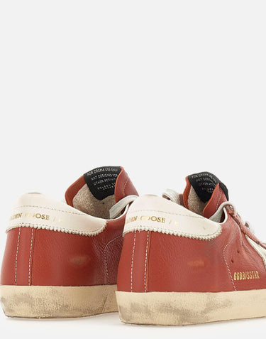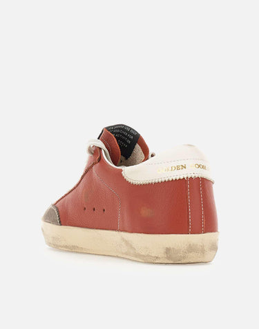 Golden Goose "Super Star Penstar Classic" women's sneakers brick red leather with a distressed finish, a grey suede toe with laces, a white heel tab with logo, a gold logo lettering on side, iconic white star, a logo on tongue, flat laces, and a regular fit. Made in Italy.