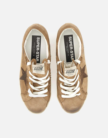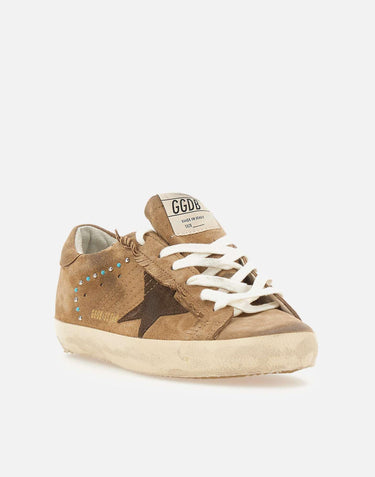 Women's Golden Goose "Superstar Classic with list" sneakers in suede, cognac, used effect, iconic chocolate star on side, logo on tongue and back, flat cotton laces, gold logo lettering on side, silver and turquoise beads, fringe detail on profiles, holes on toe for breathability, used effect rubber sole height 2.5 cm. Made in Italy. Regular fit. For those who usually opt for half size it is advisable to go up a size since brand does not use half sizes.
