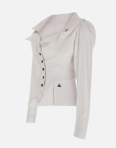 Vivienne Westwood "Monday Shirt," white, organic cotton, contrasting button closure, origami-inspired pleats at neckline, multicolored Orb embroidered at hem, fitted fit, puff sleeves inspired 1930s American Midwest, regular fit. Made in Italy