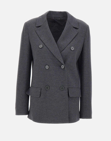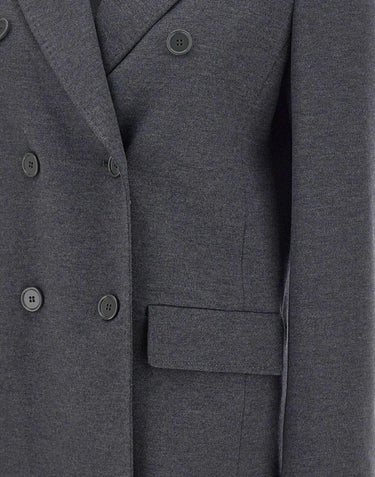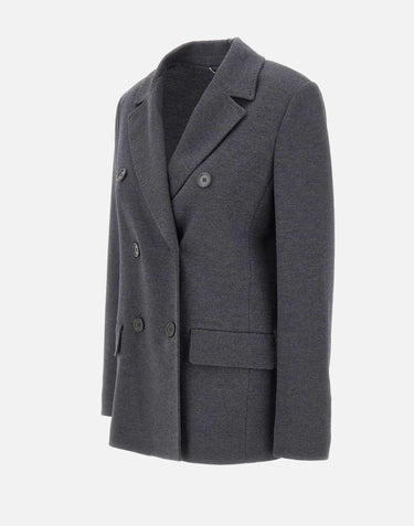 Max Mara's "Giuditta" blazer in a wool, cotton, and viscose blend, available in anthracite gray. It features notched lapels, a double-breasted closure with matching buttons, patch pockets with flaps, and slit cuffs. Padded shoulders add structure, while the relaxed fit makes it perfect for formal and contemporary looks.