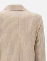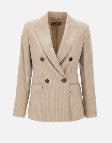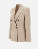 Max Mara Studio "Pucci" blazer stretch wool flannel featuring a refined pinstripe pattern on a sandy beige background. Tailored construction with peak lapels, double-breasted four-button closure, and flap pockets on front. Finished with buttoned cuffs, central back vent, and full lining for a polished silhouette. Regular fit with a slightly fitted cut, ideal for office and formal wear.
