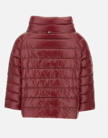Herno "Sofia" women's mini down cape, burgundy, Herno Iconic, made from iconic 200-gram Ultralight nylon with a silky feel, crater collar, injected padding in the finest goose down, concealed button closure, gold hardware, side welt pockets, jeweled sleeves, regular fit. Wr. treatment.