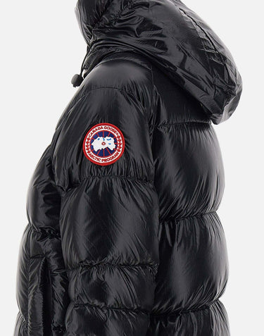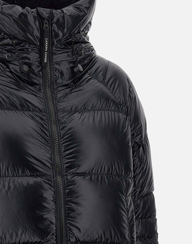 Canada Goose "Cypress" woman down jacket, black, recycled Feather-Light-Ripstop fabric, ultralight, with water-repellent finish, padded, side zips for easy fit, hood with drawstring, front fastening with logoed zip, two side pockets, retractable cuffs in jersey, iconic logo patch on sleeve, inside pocket, internal backpack straps to carry jacket on shoulders, ideal garment for cold season.