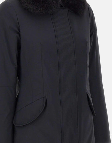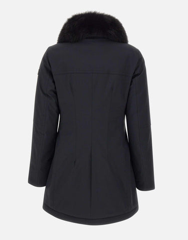 The Peuterey "Desmot KL Fur" women's down jacket, black, is crafted from Teflon EcoElite stretch nylon with a high-performance membrane that's resistant to rain and wind. Filled with recycled down for sustainable warmth, it features a padded shirt collar, a concealed double zip and button closure, front flap pockets with buttons, and a detachable Saga Furs-certified fox fur collar. This jacket is ideal for transitional seasons, offering optimal protection in temperatures between +10°C and +5°C. Slim fit.