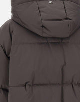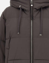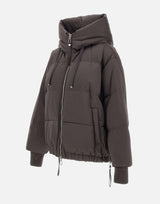 Piumino Duno "Hekan" da donna in nylon effetto satin nero, con cappuccio fisso regolabile tramite coulisse a nastro e chiusura frontale con zip a doppio cursore. Limbottitura in piuma garantisce calore e leggerezza, mentre le tasche laterali con bottone aggiungono praticità. Fondo regolabile con coulisse, polsini in maglia e zip laterali per agevolare la vestibilità e la libertà di movimento. Spalle raglan e fit rilassato per un look contemporaneo e confortevole.