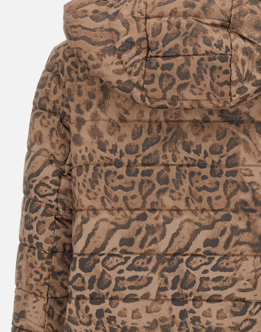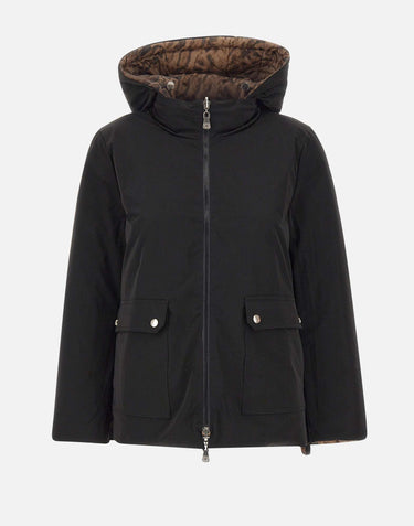 Reversible Elena Mirò puffer jacket with a black side and an animalier print side for a versatile look. Features removable hood with drawstring, two-way zip fastening with gold-tone hardware, side pockets with button closure on both sides, and hem slits for adjustable fit. Lightweight synthetic padding. Regular fit.