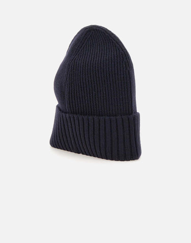 Boss "Fati" men's wool cap, navy blue, ribbed texture, lapel with mini logo label, one size fits all.