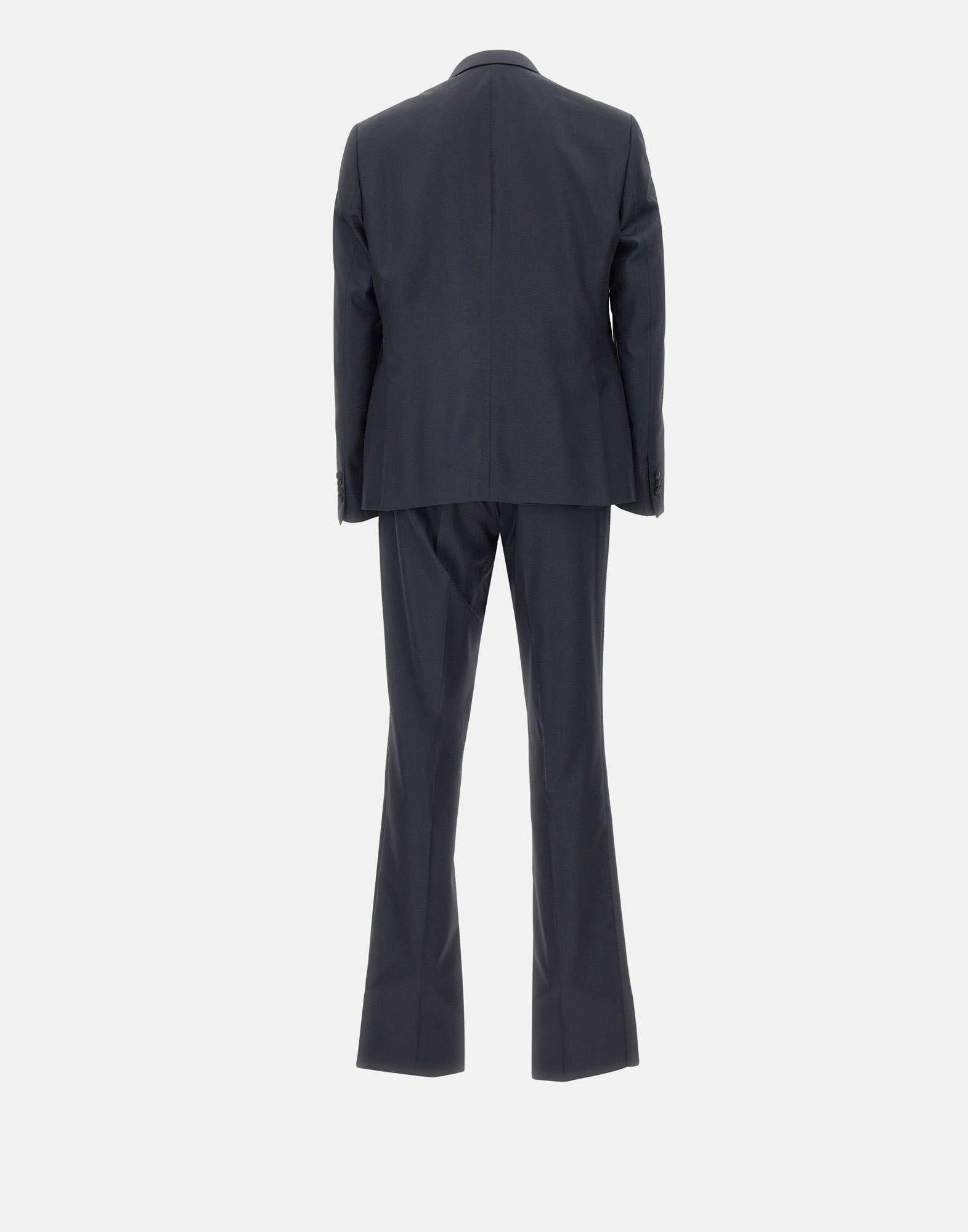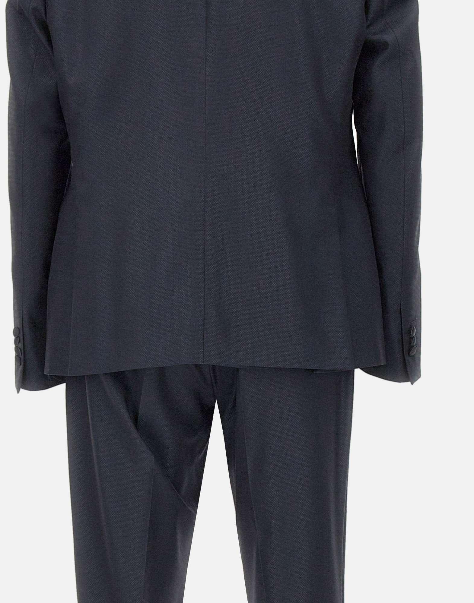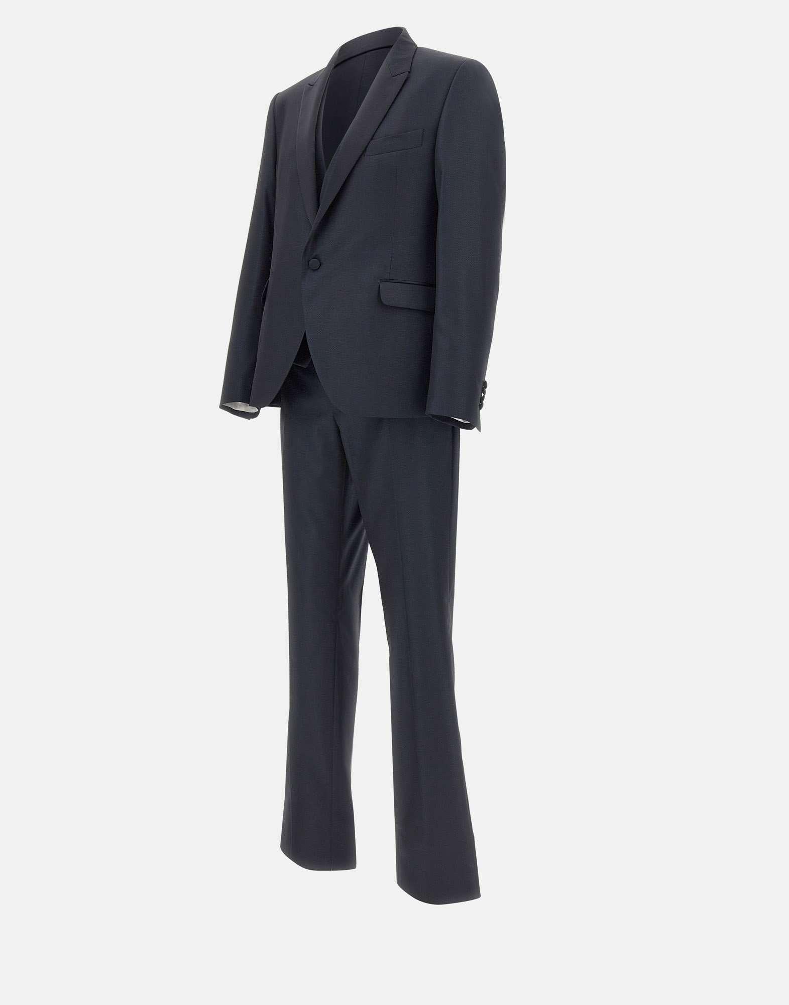 Carlo Pignatelli three-piece suit wool blend with a micro-dot pattern and satin trim, blue color. Drop PASC.
