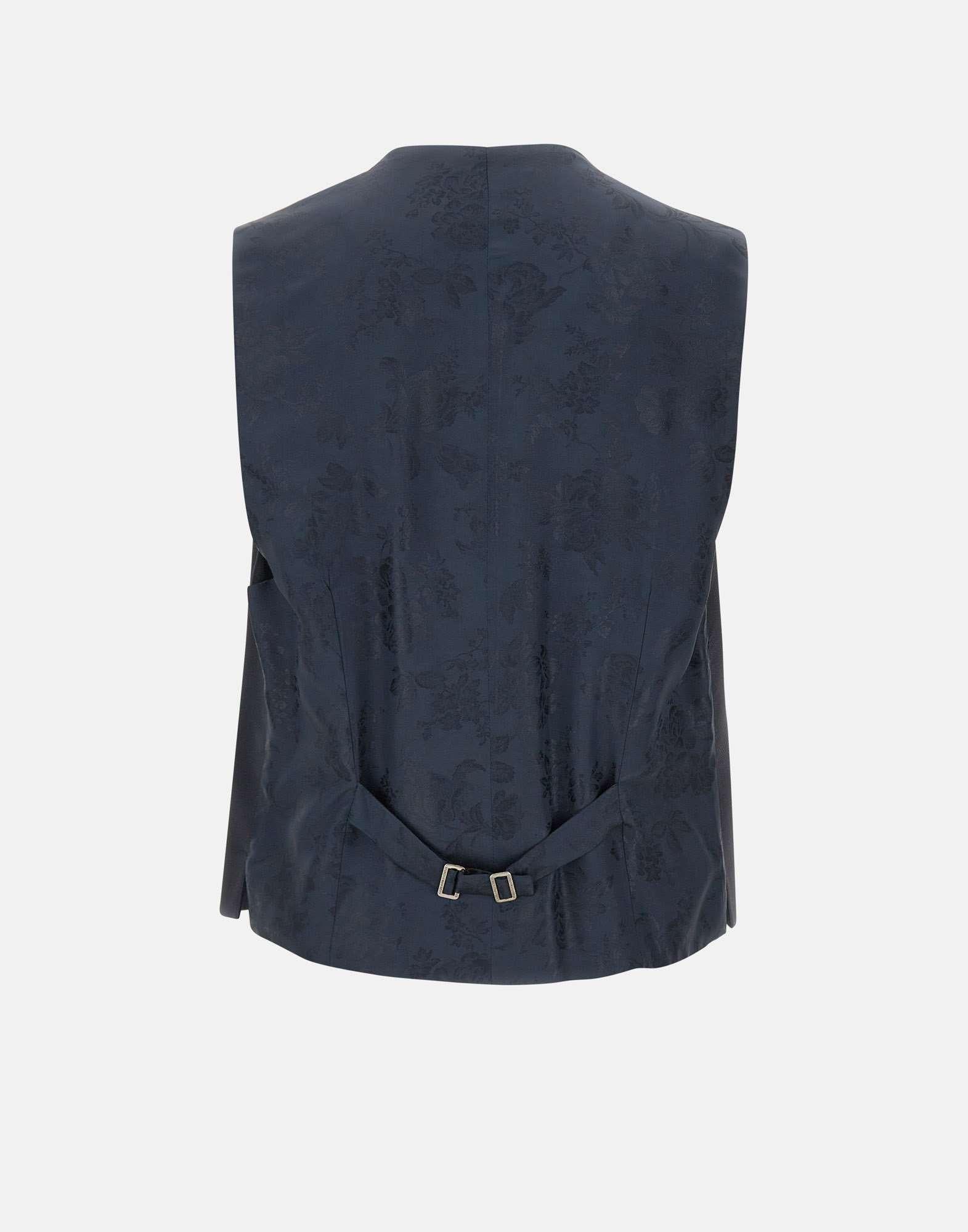 Blazer with narrow lapels, front flap pockets, covered button closure, pocket square, buttoned cuffs, side back vents, floral jacquard lining, inside pockets.
