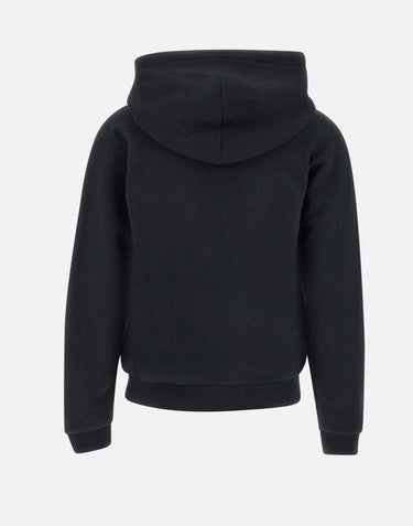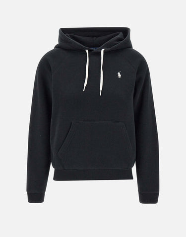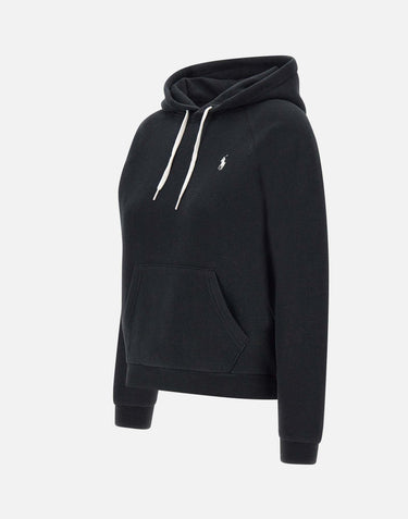 Polo Ralph Lauren women's "Classics" cotton blend sweatshirt, black, long sleeves, hood with contrasting color drawstring, kangaroo pocket, embroidered logo on chest, ribbed hems, fleece interior, regular fit.