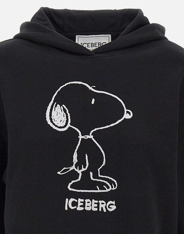 Iceberg women's soft cotton sweatshirt, black, with long sleeves and a contemporary cropped fit. It features a contrasting Snoopy logo print on front, a hood, ribbed edges, and a fleece lining. Regular fit.