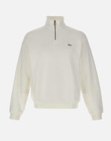 Lacoste white recycled organic cotton sweatshirt, long sleeves, crew neck, ribbed edges, brushed interior, dropped shoulders, high neck with zip and logoed metal slider, tone-on-tone embroidered crocodile with black stitching on chest, loose fit.