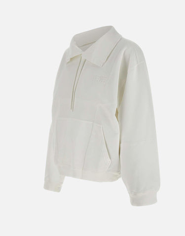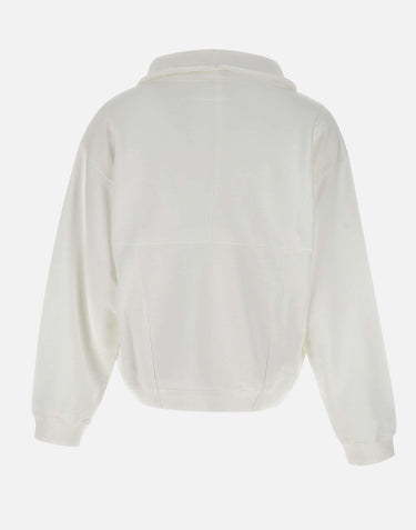 Women's MM6 Maison Margiela cotton sweatshirt, white, long sleeves, hood with deconstructed profile and drawstring, play of "cuts" construction, ribbed edges, kangaroo pocket, tone-on-tone numeric signature embroidery on chest, brushed interior, relaxed fit, made in Italy
