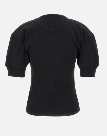 Victoria Beckham "Grey Marl Sweater" crafted in black stretch cotton with ribbed texture. Features round neckline, short puff sleeves with raglan shoulders, fitted waist, and mother-of-pearl button closure. Regular fit.