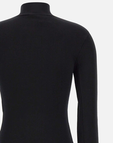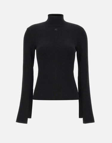 Courrèges "Interlock Mockneck Sweater", crafted in viscose-blend fabric and presented in black. Featuring a high neck and long sleeves, it is defined by deconstructed cuffs and a distinctive sleeve detail, enriched with embroidered AC logo on front. The slim fit enhances the silhouette with modern elegance.