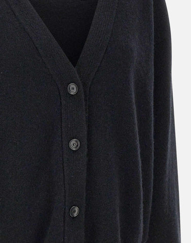 Womens "Knitted cardigan" by Laneus, crafted from a fine blend of cashmere and silk, elegant black hue. The design features long sleeves, a V-neckline, and front fastening with tone-on-tone buttons. Ribbed trims complete piece with a tailored touch, while relaxed fit ensures comfort and contemporary style. Made in Italy.