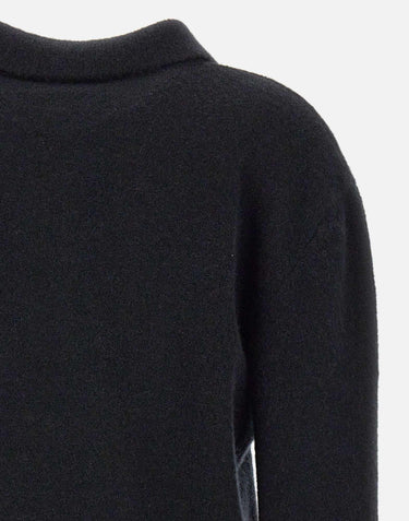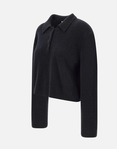 Womens Knitted polo cropped shirt by Laneus, crafted from a fine blend of cashmere and silk, black color. The design features long sleeves, a classic collar with button fastening, and a cropped cut for a contemporary allure. Ribbed trims complete the piece with a tailored touch, while the regular fit ensures comfort and elegance. Made in Italy.