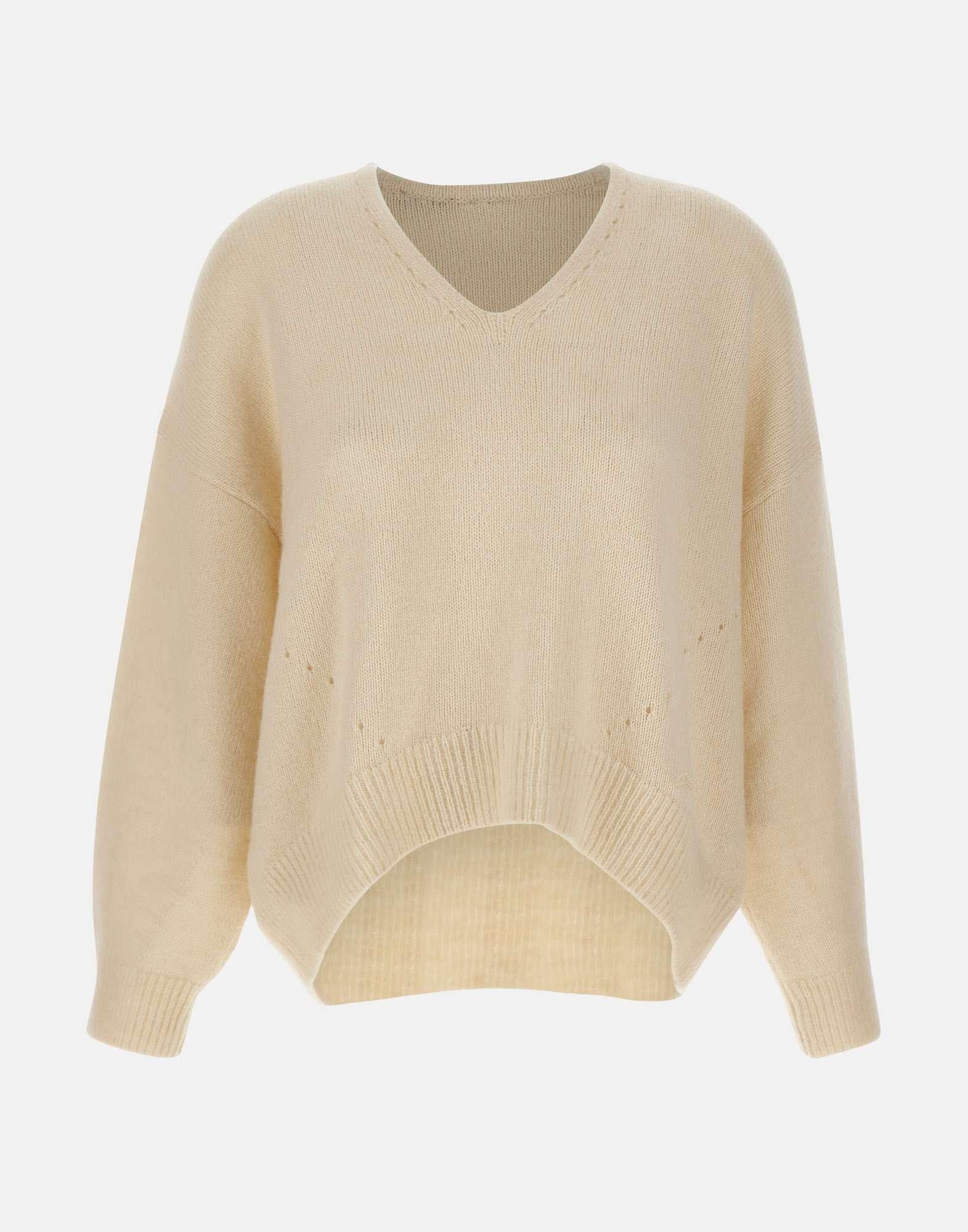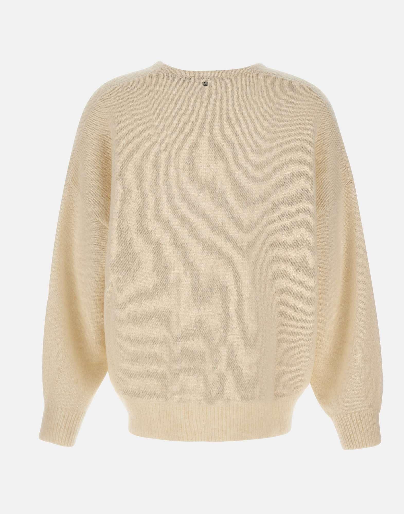 Womens Boss "Fondyssa" sweater, from the Boss Women Orange collection, crafted in a refined blend of Italian wool and alpaca. Presented in milk white, it features V-neckline, long sleeves, and raglan shoulders that enhance its relaxed character. Designed with an oversized fit for modern elegance and comfort.