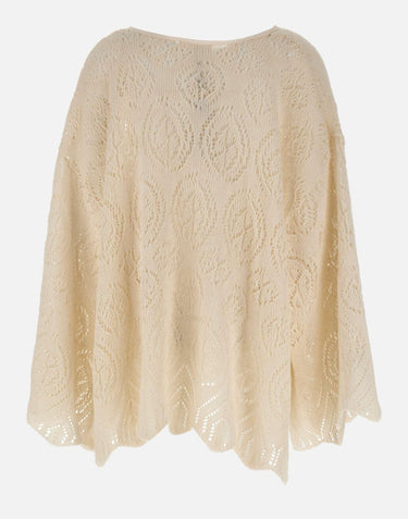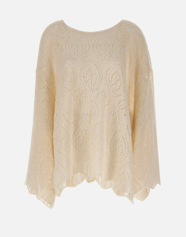 Maurizio Mykonos sweater made of a wool and alpaca blend, available in cream with a textured weave. The design features a wide round neckline with matching fabric trim and wide long sleeves with voluminous cuffs. The oversized fit enhances the contemporary, artisanal style of the piece. Made in Greece.
