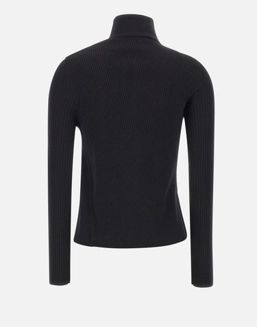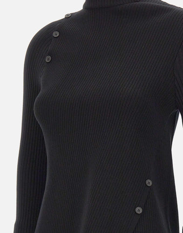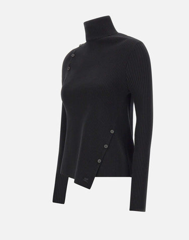 Courrèges "Oblique Buttoned Sweater", crafted in black ribbed knit viscose blend. Designed with slim fit, high neck, long sleeves, and asymmetric construction with raw-cut details at shoulders and sides, enhanced by tonal button accents. Finished with embroidered AC logo on chest.