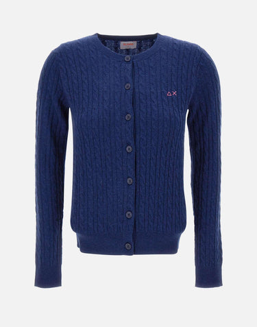 Sun68 women's "Roundneck Cable Cardigan" merino wool and cashmere, blue, long sleeves with a crew neck, ribbed edges, and a refined cable knit. Embellished with an embroidered logo on chest, it offers a regular fit, perfect for a casual and comfortable look.