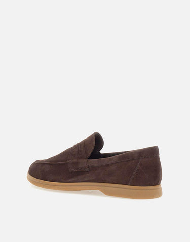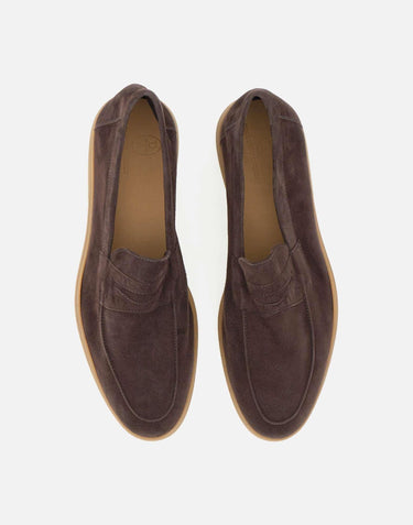 Duca Degli Abruzzi "Amalfi" men's moccasins suede, dark brown colour, visible handcrafted stitching, soft leather interior, logoed insole, rubber sole contrasting colour, sporty chic character, 1.5cm heel. Made in Italy. Regular fit