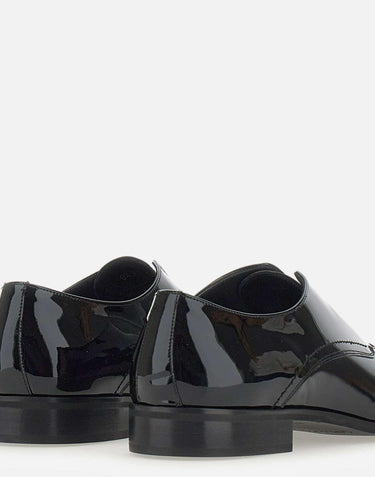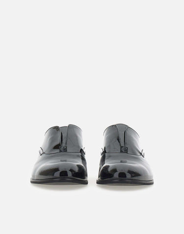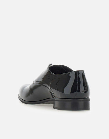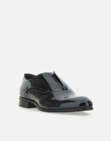 Carlo Pignatelli Flash patent leather formal loafers, black color, exposed stitching, no laces, comfortable and regular fit, front mini logo label, 2cm heel, rubber sole, made in Italy