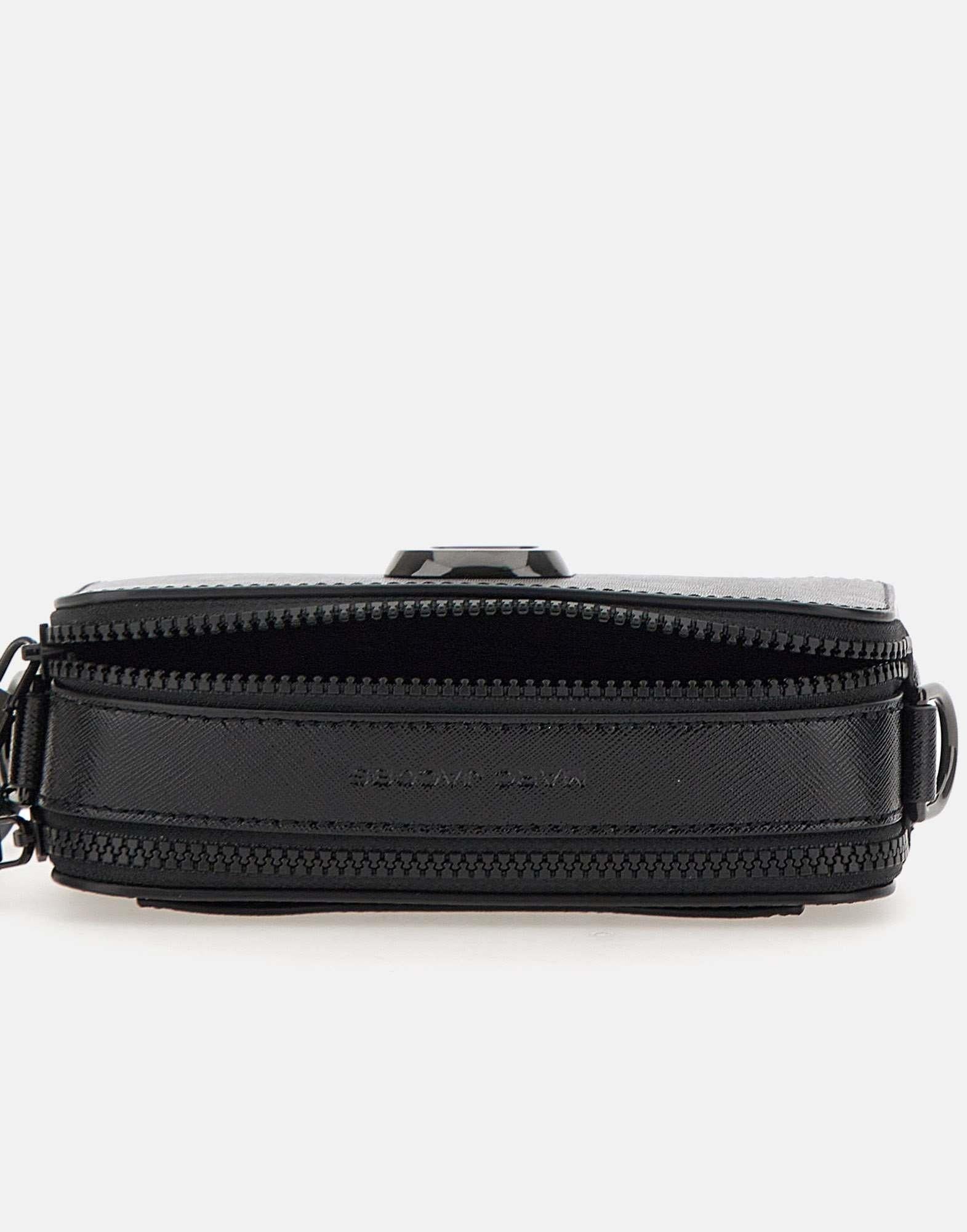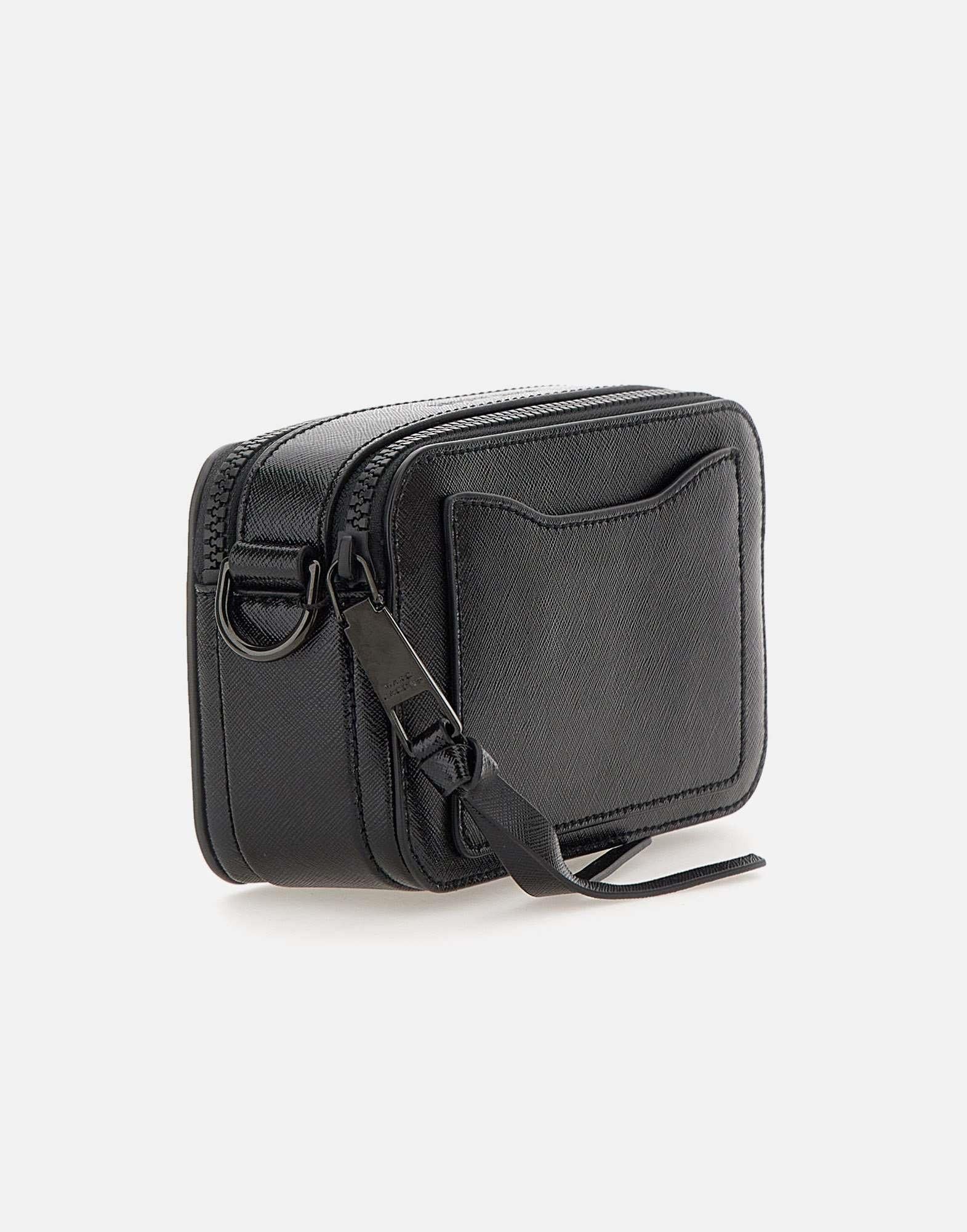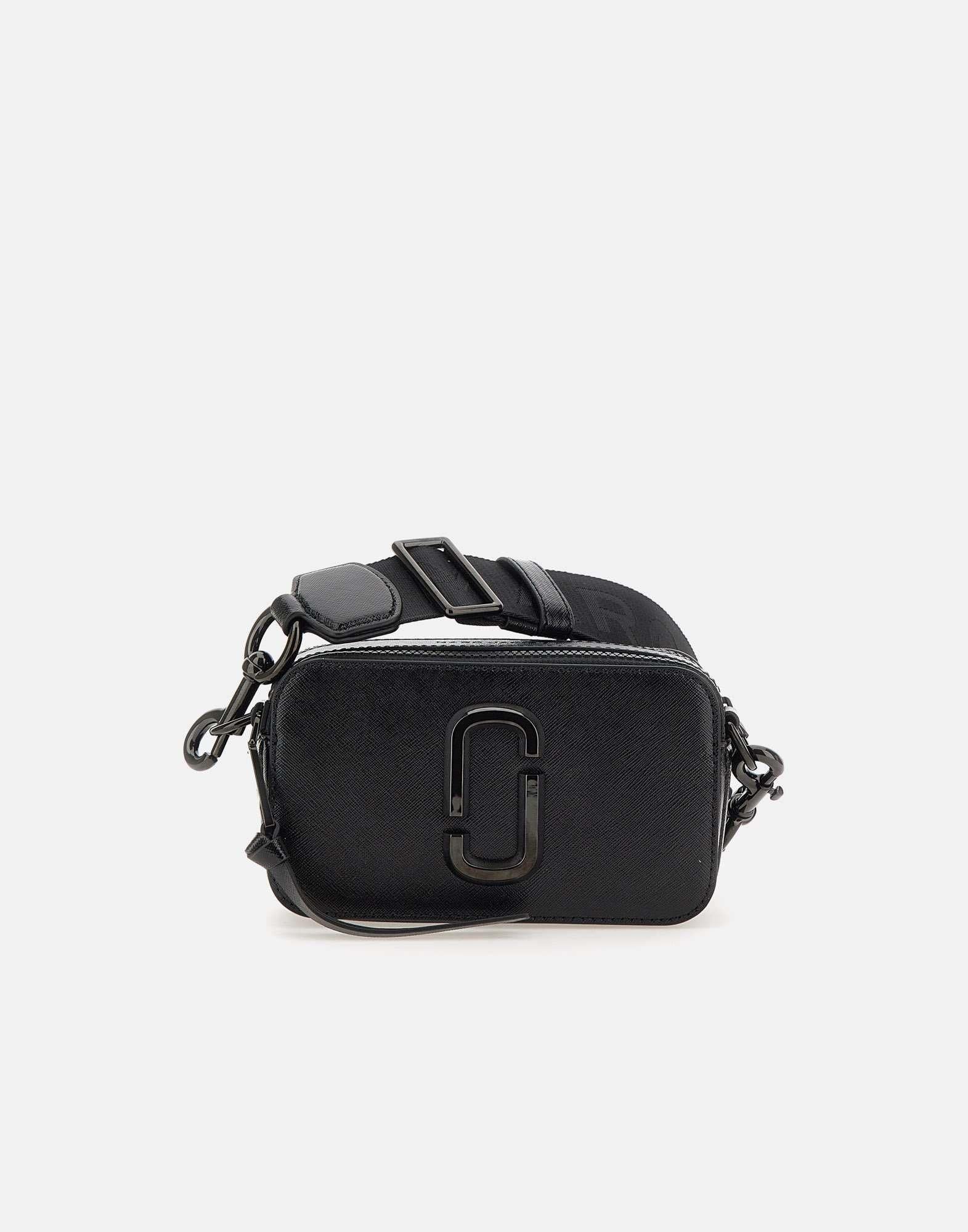 Marc Jacobs Saffiano leather shoulder bag "The Snapshot", black, removable logoed and matching shoulder strap, double central compartment with zip fastening and leather zip puller, front embossed logo, one internal slot pocket, black metal finishes. Dimensions: width 18cm, height 11cm, depth 6cm. Shoulder strap length 126cm.