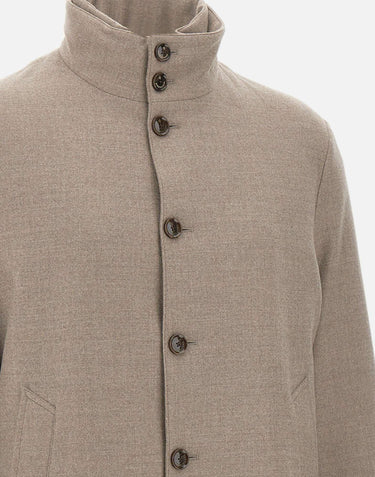 Montecore men's coat in dove grey wool, elegant and versatile. Rain System technology protects against rain. Featuring a removable, down-padded inner bib with a zip closure, it's ideal for protecting you from the cold on transitional days. It features a high collar, a front closure with logoed horn buttons, and a central back vent for comfort. Regular fit.