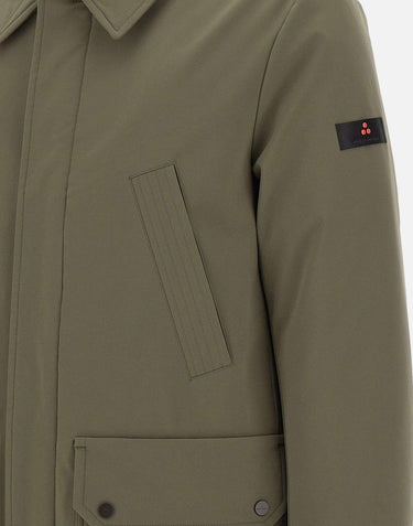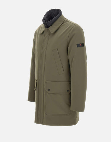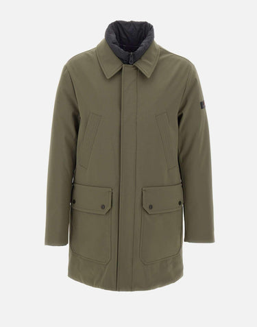 Men's Peuterey "Loch TJ" carcoat in sage green, crafted from recycled polyester stretch fabric with a twill weave for a clean, matte finish. Logo on the left sleeve. Front zip closure with a concealed flap, double collar (classic and stand-up), buttoned cuffs, internal pockets, handwarmer pockets, and large front pockets with flaps and buttons. 650 Fill Power certified natural down padding for lightweight, breathable warmth. Windproof and water-repellent fabric with a removable inner lining for optimal weather protection. Regular fit.