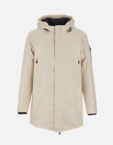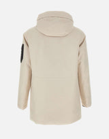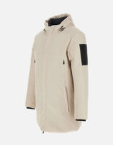 Parka uomo Boss "Hexatech", colore panna, realizzato in tessuto tecnico Hexatech a due strati, antivento, traspirante e water resistant. Dotato di cappuccio regolabile con coulisse, chiusura frontale con zip e patta con bottoni, quattro tasche anteriori con zip, tasca interna e tasca sulla manica sinistra con logo. Polsini rientranti in maglia e coulisse in vita per una vestibilità personalizzata. Imbottitura sintetica che garantisce calore e comfort senza appesantire. Parte della Boss Green Collection. Vestibilità regular.