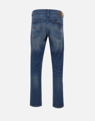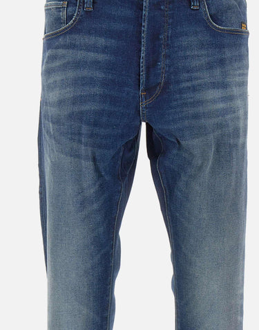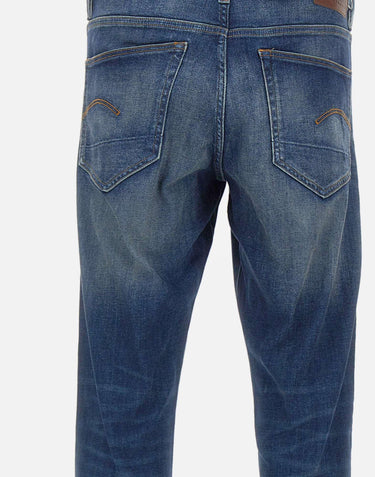 G-Star Raw men's "3301" jeans, blue denim with lightening, crafted from 9.7 oz Joane stretch denim for comfort and freedom of movement. They feature a mid-rise waist with belt loops, a concealed button fly with a silver logo top button, a classic five-pocket design, and a leather logo patch on the back. Slim fit for a modern and versatile look.