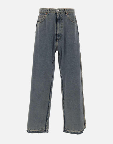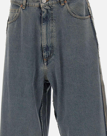 MM6 Maison Margiela jeans in washed blue denim, fitted with a bold volume and an experimental aesthetic. They feature exposed side seams, contrasting raw-edge inserts in a tonal color, and five-pocket construction. They have a zip and logo button closure, a 32 cm leg cuff, and an 87 cm inseam (size 34). The back features a logo patch and the iconic white stitching, a hallmark of the Maison. Made in Italy.