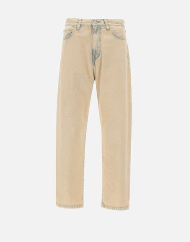 Carhartt WIP "Landon Pant" trousers, sand with blue denim highlights and stonewashed finish, crafted from 12oz Robertson cotton with a distinctive worn-in look. The five-pocket design features a logo button and zip fly, bartack stitching for added durability, and a logo on the back. The cut is wider at the top of the leg and narrows towards the bottom, with a width of 21 cm. Inseam 75 (size 30). Loose tapered fit.