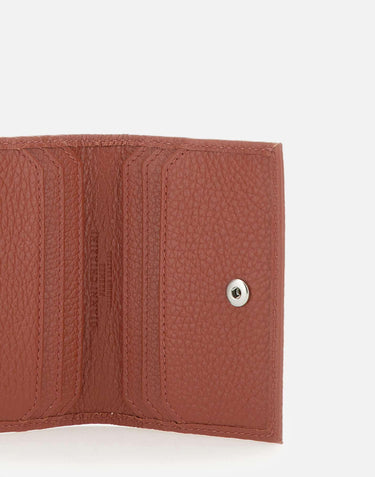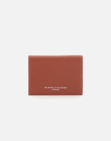 Gianni Chiarini hammered leather card holder, brick color, button closure, multiple compartments for cards and membership cards, silver logo on outside. Measurements: 11 cm length, 8 cm height, 2 cm depth.