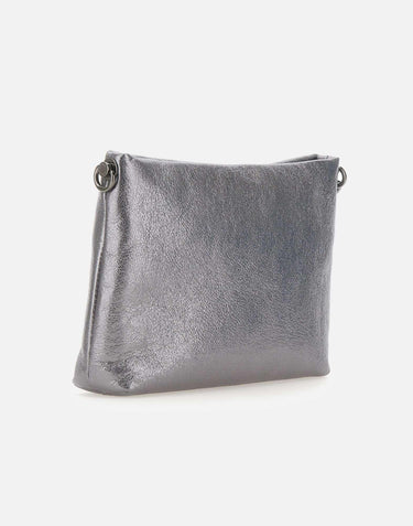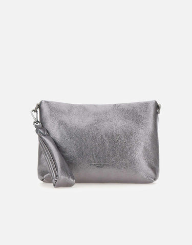 Gianni Chiarini "Brenda" leather clutch bag, silver color, zip closure, silver hardware, wrist strap, internal lining, two internal pockets, one with zip and logo patch, logo printed on the front, removable and adjustable fabric shoulder strap included 100cm, Made in Italy. Dust bag included. Measurements: length 28cm, height 20cm, depth 5cm.