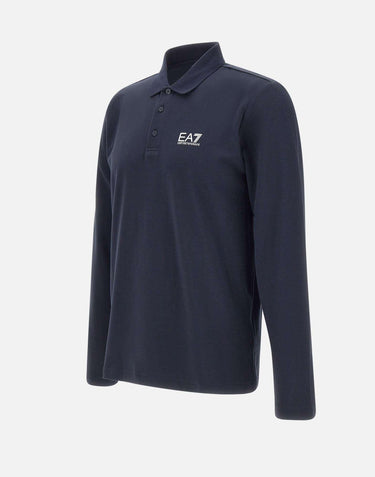 EA7 "Core identity" men's polo shirt in stretch cotton, blue, long sleeves, classic collar with logo button closure, logo on chest, slim fit.