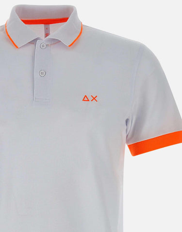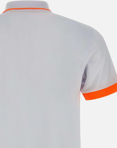Sun68 "Stripe Fluo" men's organic cotton polo, white color and contrasting fluorescent orange profiles, short sleeves, crew neck, embroidered logo on chest, mini slits at hem, regular fit.