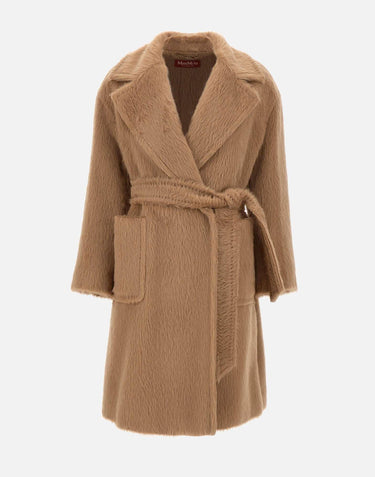 Max Mara Studio "Ottanta", camel colour, real alpaca fur and virgin wool coat, collar with wide lapel, hidden button closure, belt to tie at waist, front pockets, entirely lined in viscose, oversized fit
